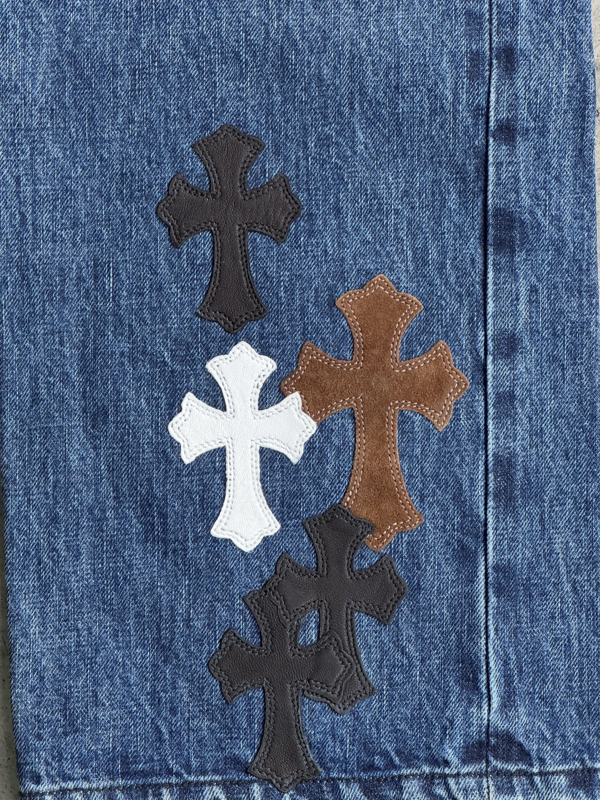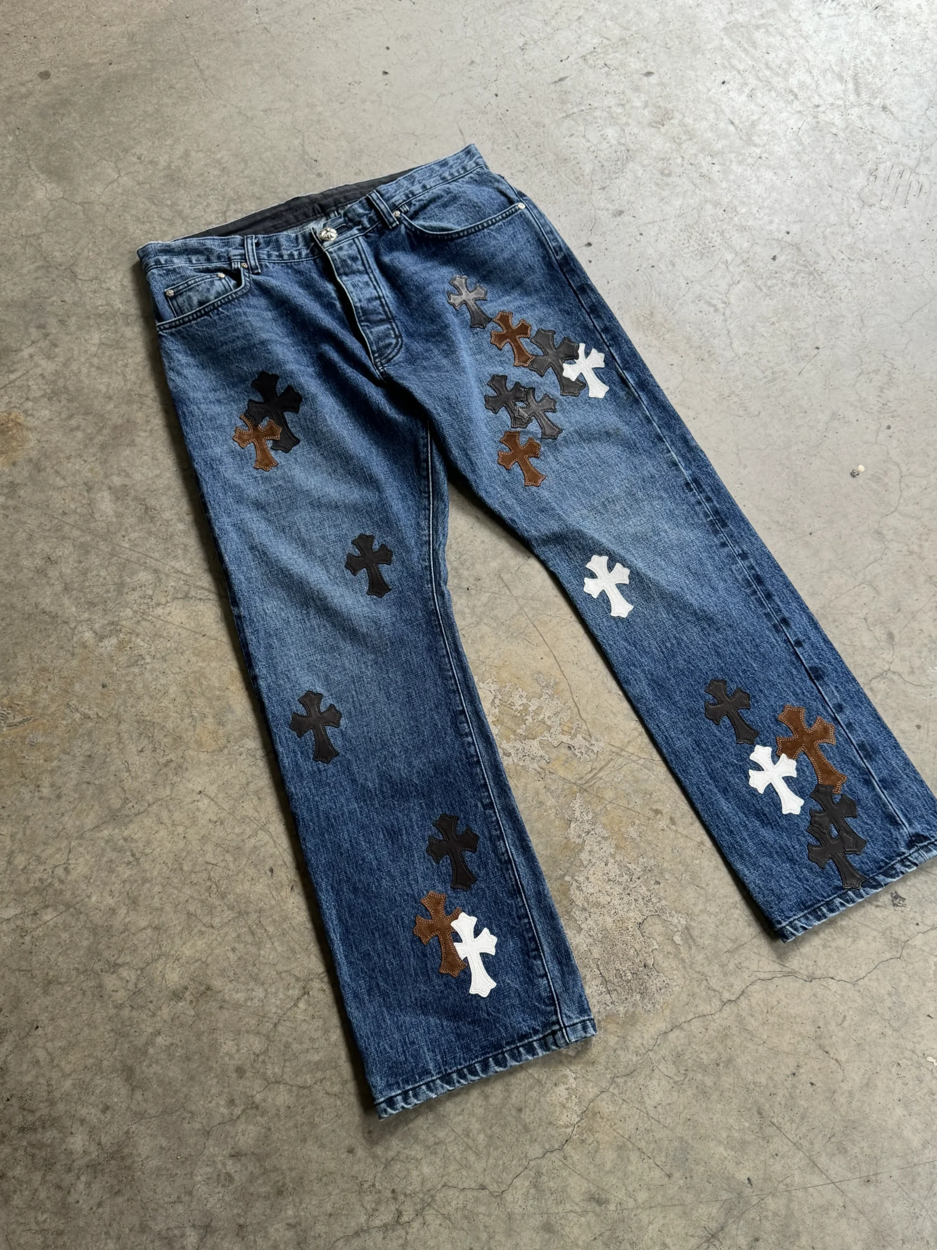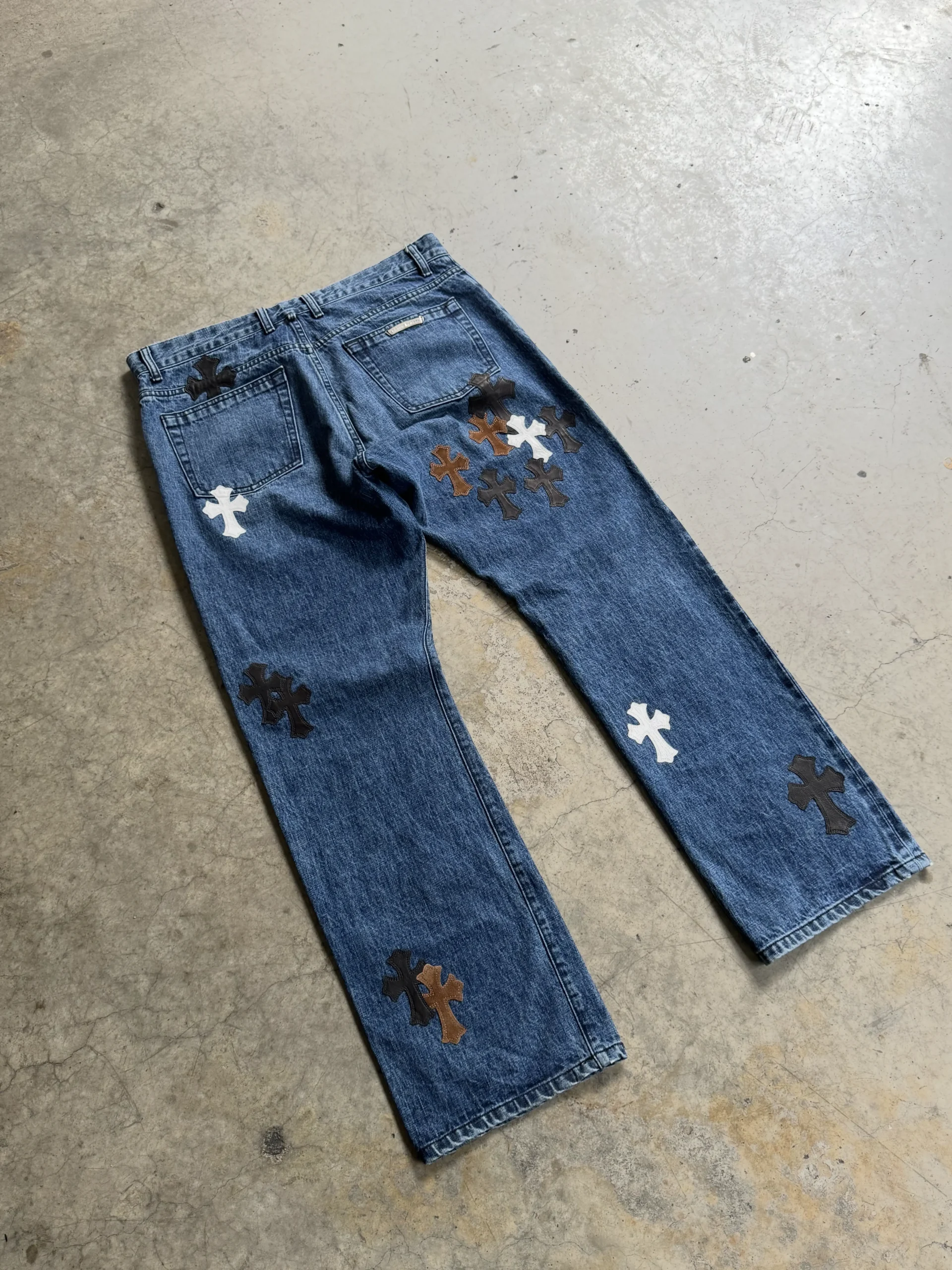 Chrome Hearts 35 Patch In House Denim Jeans ขนาด 36 เป็นกางเกงยีนส์เดนิมที่ตกแต่งด้วย 35 แพทช์ (Cross / Leather / Textile Patches) ตามสไตล์ Chrome Hearts เนื้อผ้ายีนส์มีความหนาและคงรูป มีโลโก้หรือรายละเอียดการปัก/เย็บบนผ้าแต่ละจุด